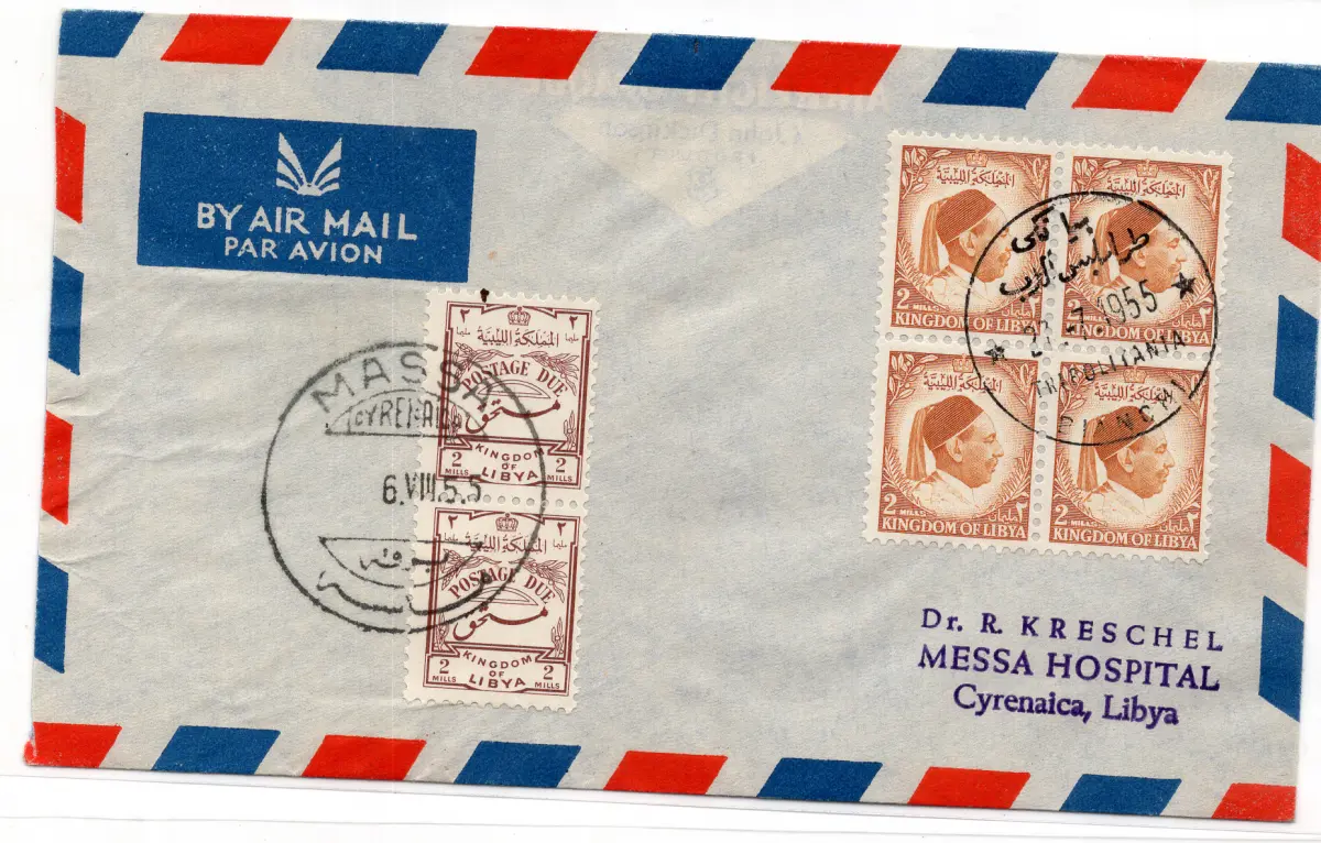 Umschlag - - - Unabhängiges Libyen - König Idris 2 m. Ocker Nr. 34 Viertel auf Umschlag von Weißen Tripolitanien am 27.7.55 für Steuermasse, die am 6.8.55 eintrifft, mit Steuermarkenpaar 2 m. Braun Nr. 1 - auf der Rückseite Ann. von Bengasi und Massa - Selten, obwohl als philatelistische Verwendung zu betrachten Cod. 2551/WEB