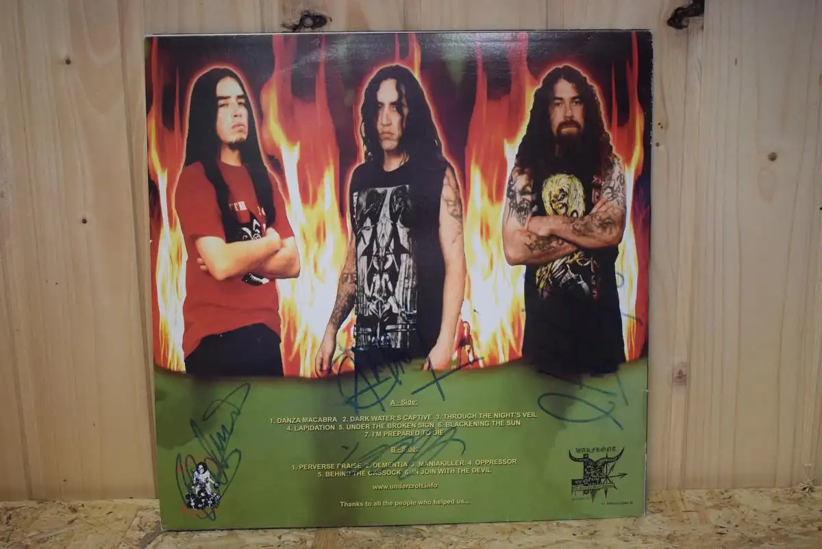 Cover mit etwas deutlicheren , umlaufenden Gebrauchspuren an Ecken und Kanten und leichten Abschürfungen auf den Flächen , LP mit leichten rein oberflächlichen Gebrauchspuren , spielt sehr gut . Achtung !! Rückseite mit Autogrammen der Bandmitglieder signiert .