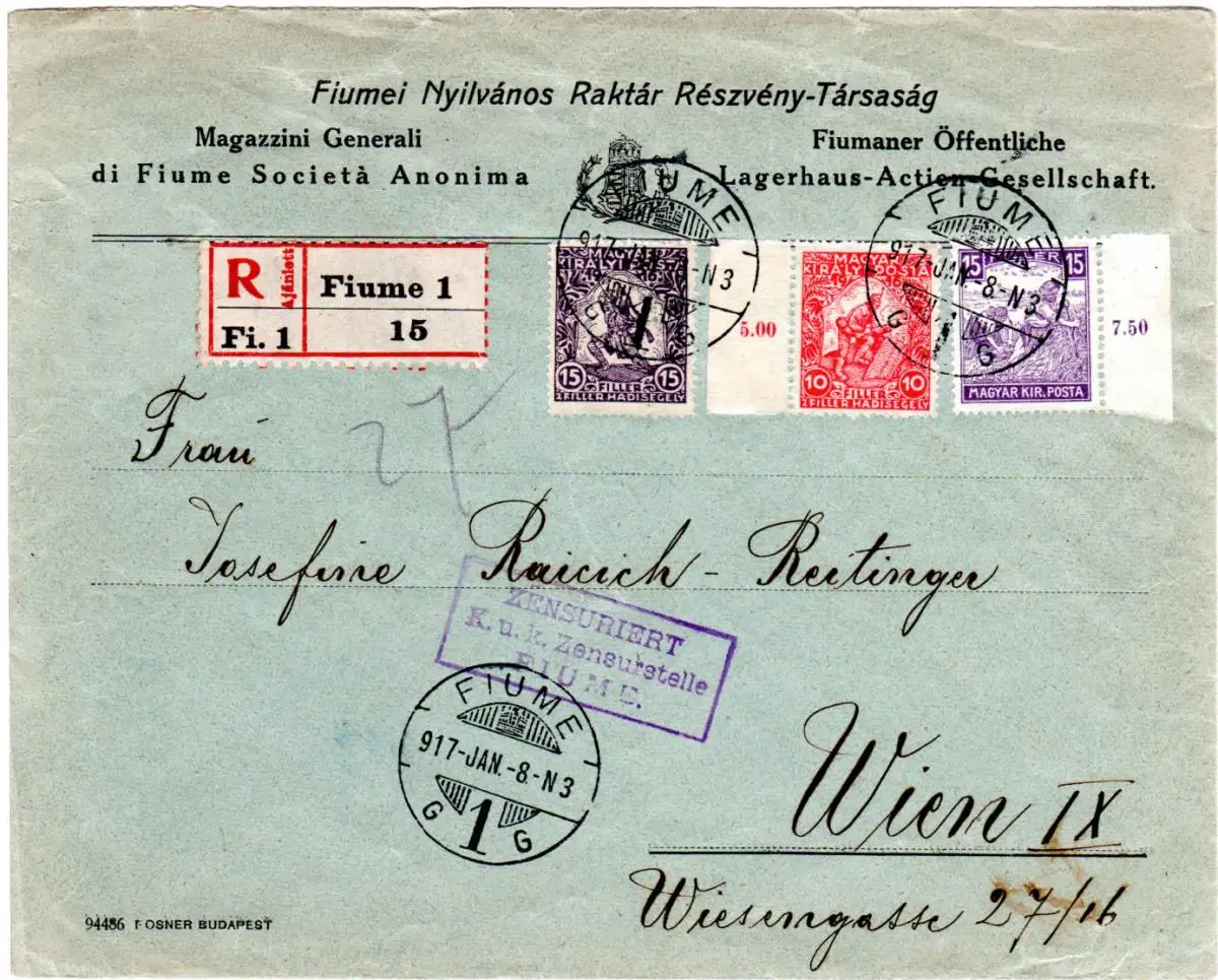 Ungarn 1917, 15+10+15 F. auf Einschreiben Zensur Brief v. Fiume n. Österreich.