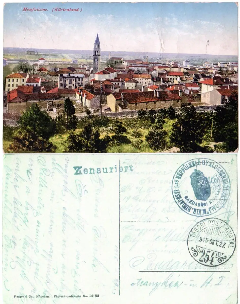 Ungarn/Italien, Monfalcone, 1915 m. Feldpost gebr. Farb-AK m. Zensur