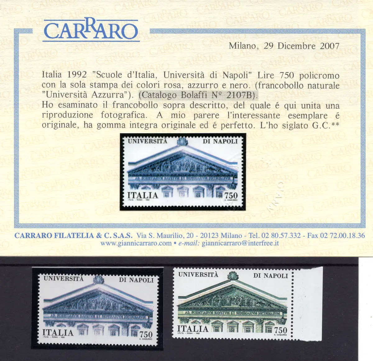 MNH - Vollgummi - - Universität Neapel Nr. 1985 ohne Gelbdruck - Naturmarke Blaue Universität Kat. Bolaffi Nr. 2107B - Selten, 50 bekannte Exemplare - Zert. Carraro Cod.769/182