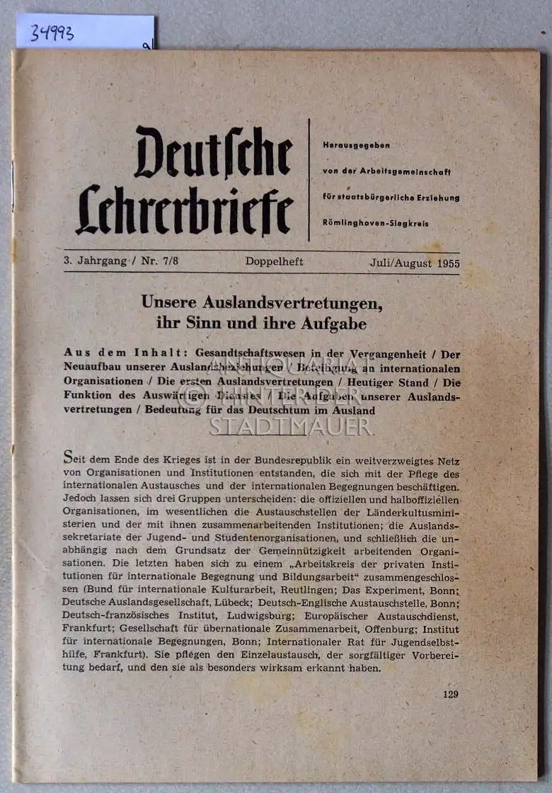 Titel: Unsere Auslandsvertretung, ihr Sinn und ihre Aufgabe. [= Deutsche Lehrerbriefe, 3. Jg. Nr. 7/8, Juli/August 1955]