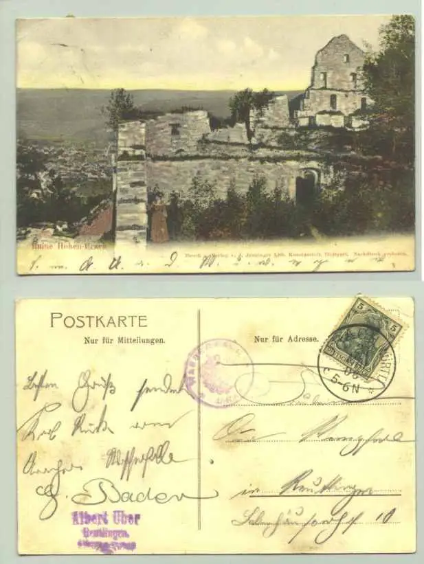 Urach 1906 (intern : 1020517) Artikelbeschreibung u. Zustand : Siehe Scan. Weitere Infos : Ruine Hohen-Urach. PLZ-Bereich pauschal 72574. Postalisch gelaufen 1906