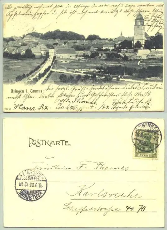 Artikelbeschreibung u. Zustand : Siehe Scan. Weitere Infos : Alte Ansichtskarte "Usingen i. Taunus". PLZ-Bereich 61250. Beschrieben u. postalisch gelaufen mit Marke u. Stempel von 1905