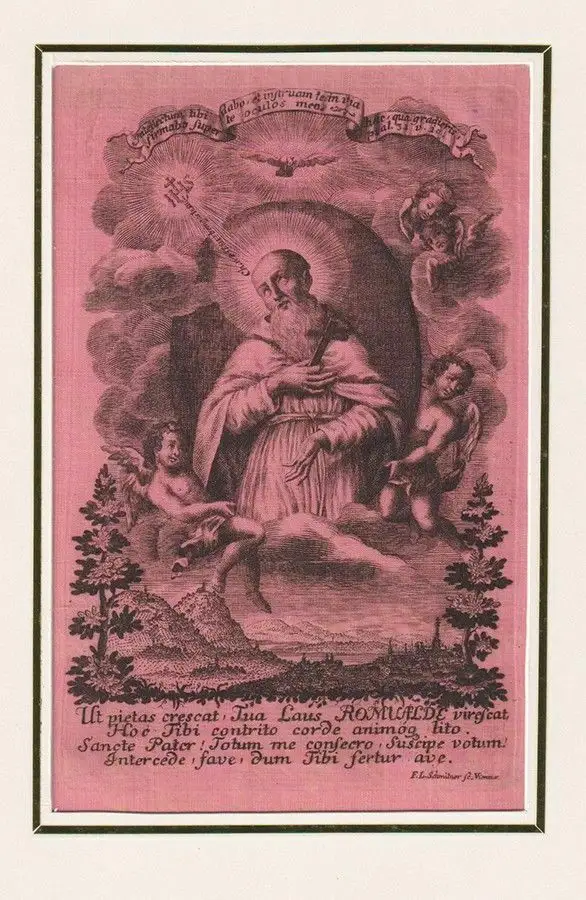 Bemerkungen: Dargestellt ist der Heilige Romuald (952-1027), Gründer des Kamaldulenserordens, mit Putti in Wolken, über ihm schwebt die Taube des Heiligen Geistes. Darunter ist eine Ansicht von Wien mit dem Kahlenberg zu sehen. 1628 berief Kaiser Ferdinand II. die Kamaldulenser nach Wien und erwarb ein Grundstück auf dem Kahlenberg zur Errichtung einer Eremitage. Während der Türkenbelagerung 1683 brannten die Gebäude, noch vor Vollendung der Kirche, aus. Etwas verkleinert wurde die Eremitage erst 1734 fertiggestellt. Heute existieren nur mehr Reste der ursprünglichen Gebäudes und die Josefskirche. Der Gedenktag des Heiligen Romuald ist der 19. Juni. Der Stich stammt von dem Wiener Kupferstecher Franz Leopold Schmitner (1703-1761).