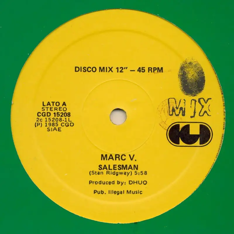 12" Maxi Marc V. - Salesman, Einheitscover der Plattenfirma; Stan Ridgway coverversion; CutOut, Zustand Platte M- Hülle VG+; Made in Italy 1985 CGD CGD 15208, Tracks 5:58, Fight In The Bronx 5:32