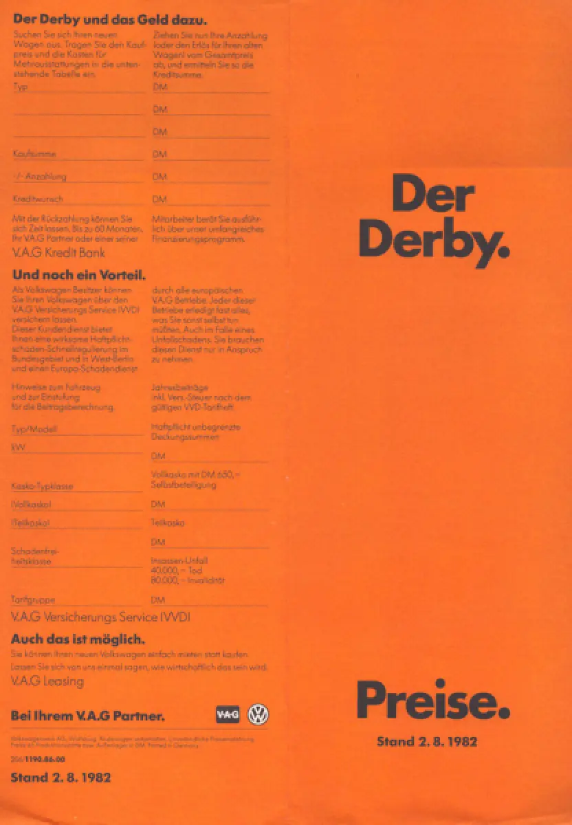 VW Derby 2 Preisliste 8.1982