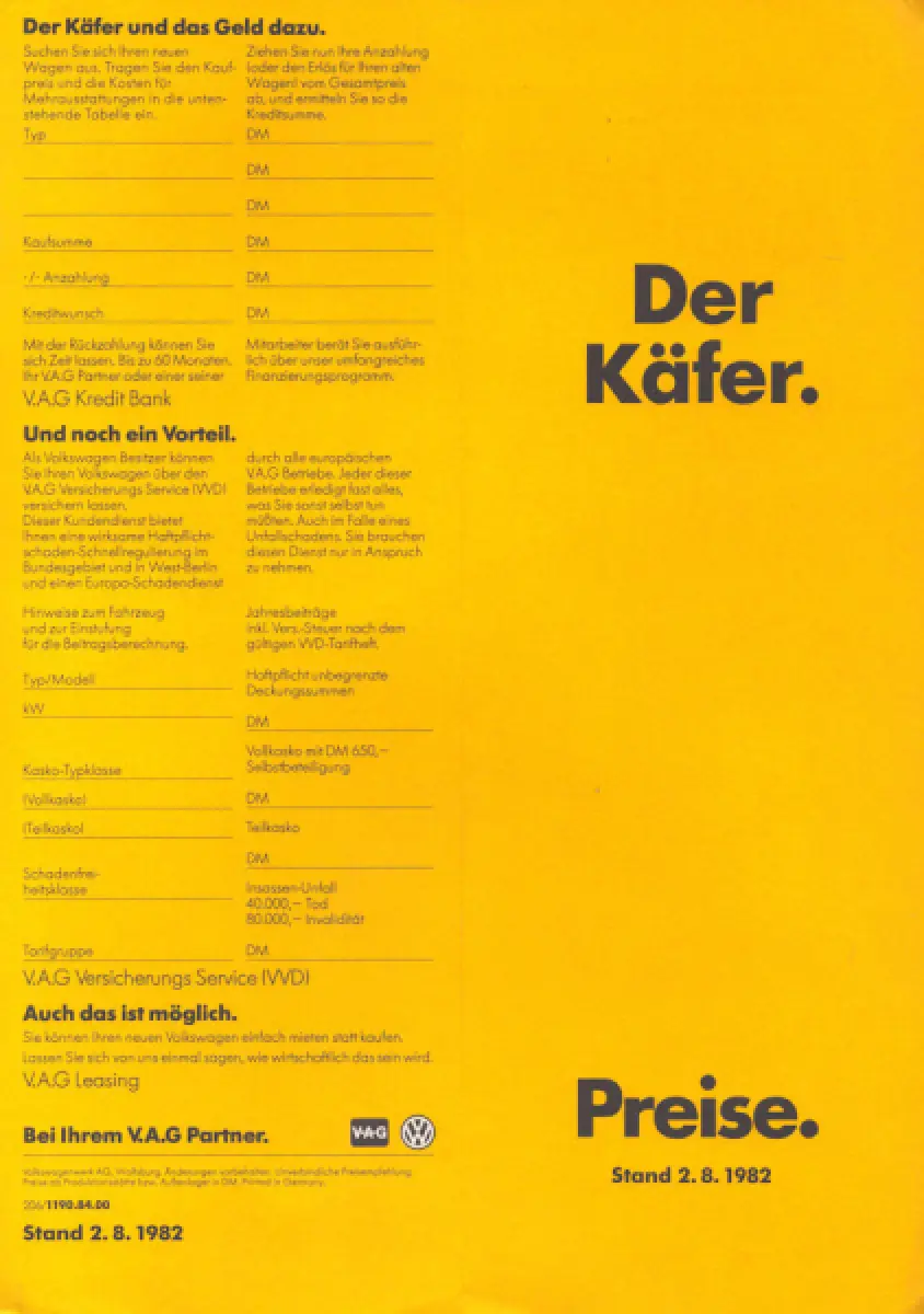 VW Käfer Preisliste 8.1982