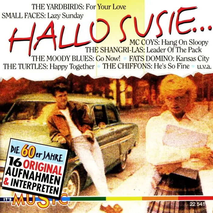 CD Album Various - Hallo Susie... Die 60er Jahre, Zustand CD VG+ Hülle M-; Made in Germany 1993 Music Digital 22 541, Tracks McCoys - Hang On Sloopy 3:04, Small Faces - Lazy Sunday 3:06, Turtles - Happy Together 2:55, Moody Blues - Go Now 3:12, Farlowe, Chris - Out Of Time 3:15, Flowerpot Men - Let's go to San Francisco 3:38, Corner, Amen - Hello Susie 2:53, Yardbirds - For Your Love 2:30, Kingsmen - Louie Louie 2:46, Shirelles - Soldier Boy 2:41, New Vaudeville Band - Winchester Cathedral 2:26, Shangri-Las - The Leader Of The Pack 2:50, Chandler, Gene - Duke Of Earl 2:29, Chiffons - He's So Fine 1:53, Dixie Cups - Chapel Of Love 2:47, Domino, Fats - Kansas City 2:25
