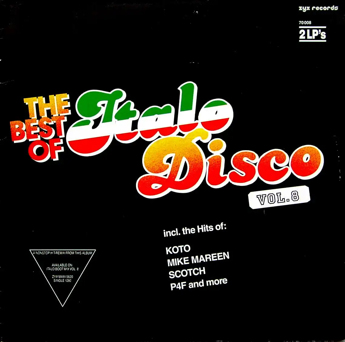 2x LP Album Various - The Best Of Italo Disco Vol. 8, seam split 4cm, Zustand Platte M- Hülle VG; Made in Germany 1987 ZYX Records 70 008, Tracks Solo - Harem 5:36, Jo Rizzo, Linda - Heartflash Tonight 5:58, Pozzoli, Silver - Pretty Baby 5:58, Mareen, Mike - Agent Of Liberty 8:50, One, Albert - For Your Love 5:52, Nasty Boys - I Was Made For Loveing You 7:41, Ark, T. - Count On Me 6:30, Koto - Jabdah 7:34, Cleo - Go Go Dynamo 6:02, Swan - General Custer 7:06, Attack - Can't Stop 7:03, Yellow, Joe - Love at First 6:00, Laser Dance - Powerrun 5:44, Kinky Go - I'm A Winner 7:09, Scotch - Money Runner 6:19, P4F - Diamond 7:18