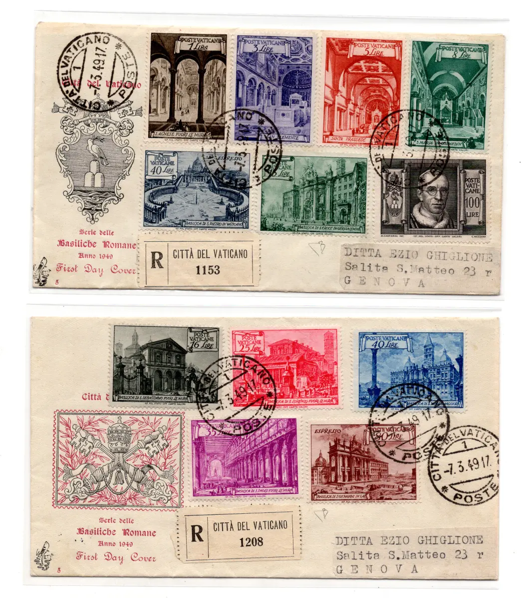 Umschlag - Vatikan - Basiliken Nr. 122/131 + Express komplette Serie auf zwei eingeschriebenen Umschlägen für Genua mit Transit- und Ankunftsstornierungen - Selten - Zert. ED Cod. 635/17