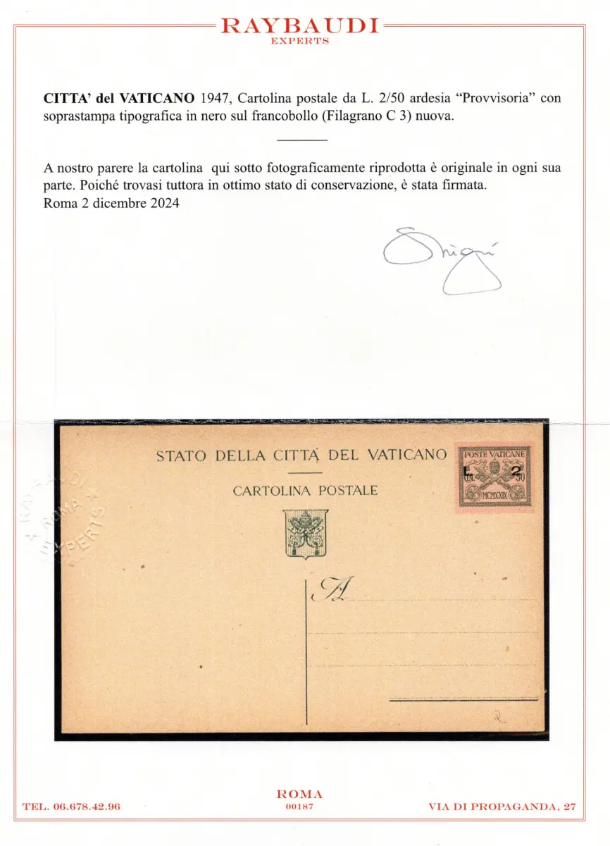 Postkarte - - Vatikan - Postkarte Lire 2 auf Cent. 50 Filagran Katalog Nr. 4 - neu perfekt - selten - Raybaudi Zertifikat Cod. 2725/WEB