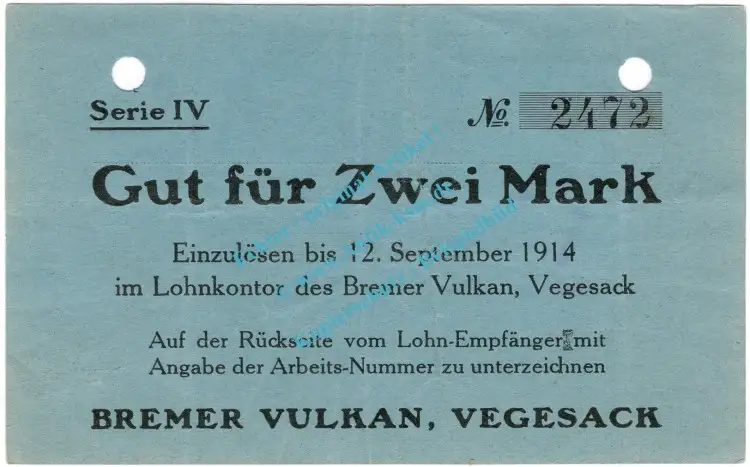Gutschein / Banknote Bremer Vulkan Vegesack , Notgeld 1914/15Bundesland : Bremen  ,  Dießner : 412.8
