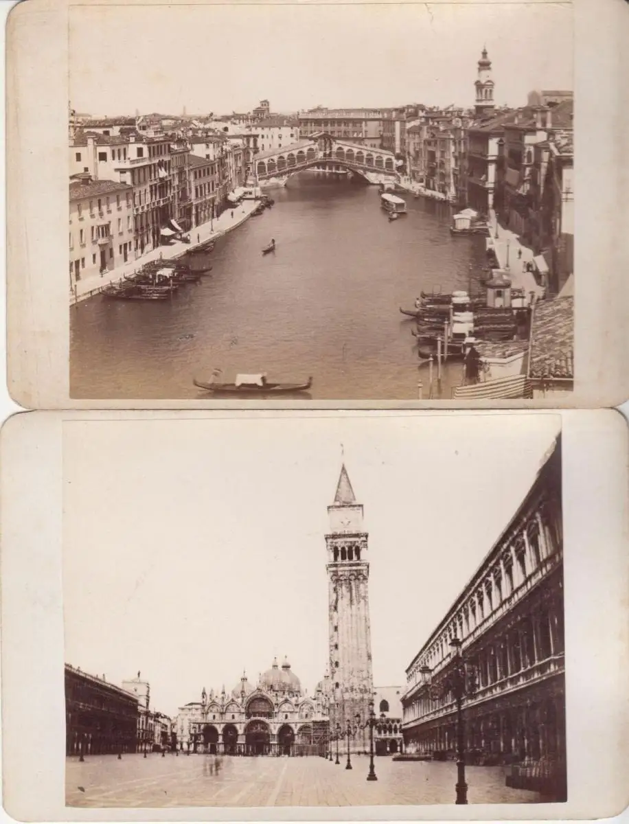 Bemerkungen: 1. Ponte Rialto. 2. Canal grande, Ponte Rialto. 3. Canal grande. 4. Ponte sospiri. 5. Piazza S. Marco. 6. Piazza San Marco (mit Markusdom). 7. Arsenal. 8. Marus- und Teodoro-Säule, Insel von San Giorgio. 9. Markuskirche. 10. Chiesa S. Maria della salute (Blick von oben). 11. Innere der Markuskirche. 12. Riesentreppen u. Brunnen im Hofe des Dogenpalastes. 13. Grabmahl Titians [Tizian] in der Kirche S. Maria dei Frari. 14. Palazzo reale.