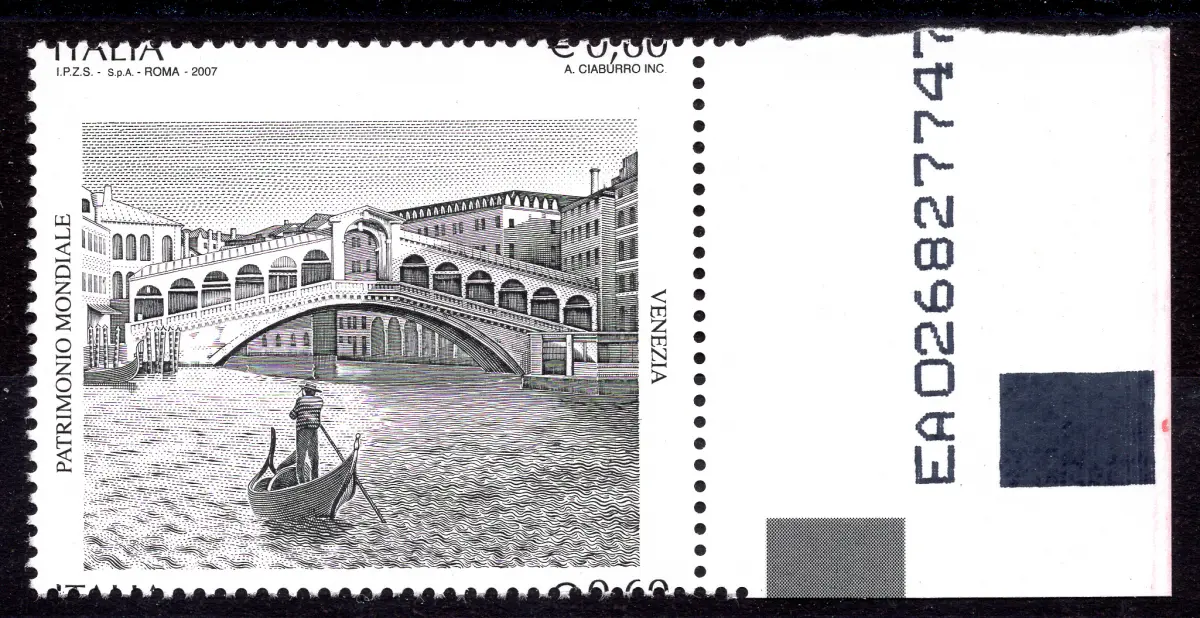 Venedig UNESCO-Welterbe Sorte verschobene Verzahnung ohne Gesichtswert Vollgummi - Venedig UNESCO-Welterbe schöner exemplarischer Bogenrand mit stark verschobener Verzahnung, Nennwert und Aufschrift ITALIEN oben statt unten - Ungewöhnlich - Cod. 1138/OUTLET