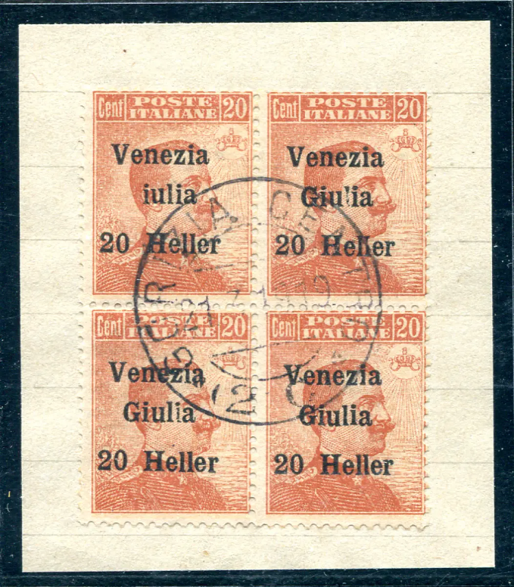 Venezia Giulia 20 Heller auf ca. 20 Sorten ULIA Fragmento - Venezia Giulia 20 Heller auf ca. 20 Nr. 31 Viertel davon ein Exemplar mit Fehlzusammensetzung: iulia (Nr. 31ca) gestempelt auf Zettel Gorizia 21.3.19 - Kat. euro 300+ Cod. 982/16