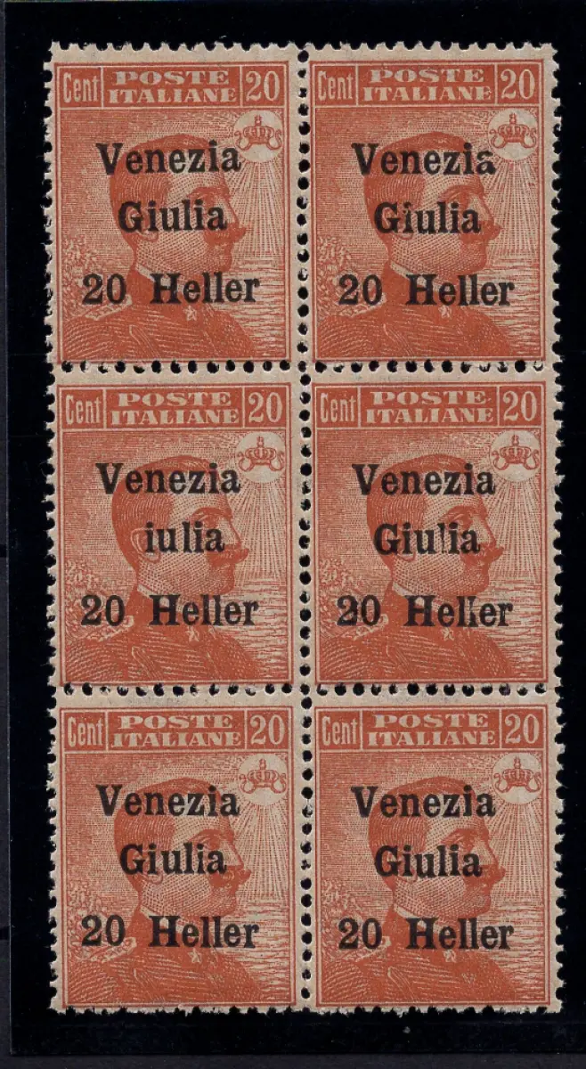 MNH - Vollgummi - Venezia Giulia - Michetti 20 Heller auf 20c. orange Nr. 31 Block von sechs Exemplaren, eines davon mit Kompositionsfehler; Buchstabe G von Julia fehlt (Nr. 31ca) - einwandfrei neu mit Vollgummi - Kat. euro 330 Cod. 2744/WEB