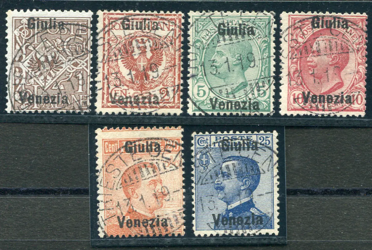 Venezia Giulia - Die ersten sechs Werte mit verschobenem Aufdruck GEBRAUCHT - Venezia Giulia - Die ersten sechs Werte mit stark verschobenem Aufdruck Giulia Venezia (Nr. 19d/24d) - Bell'ensemble - Kat. euro 570 Cod. 922/15
