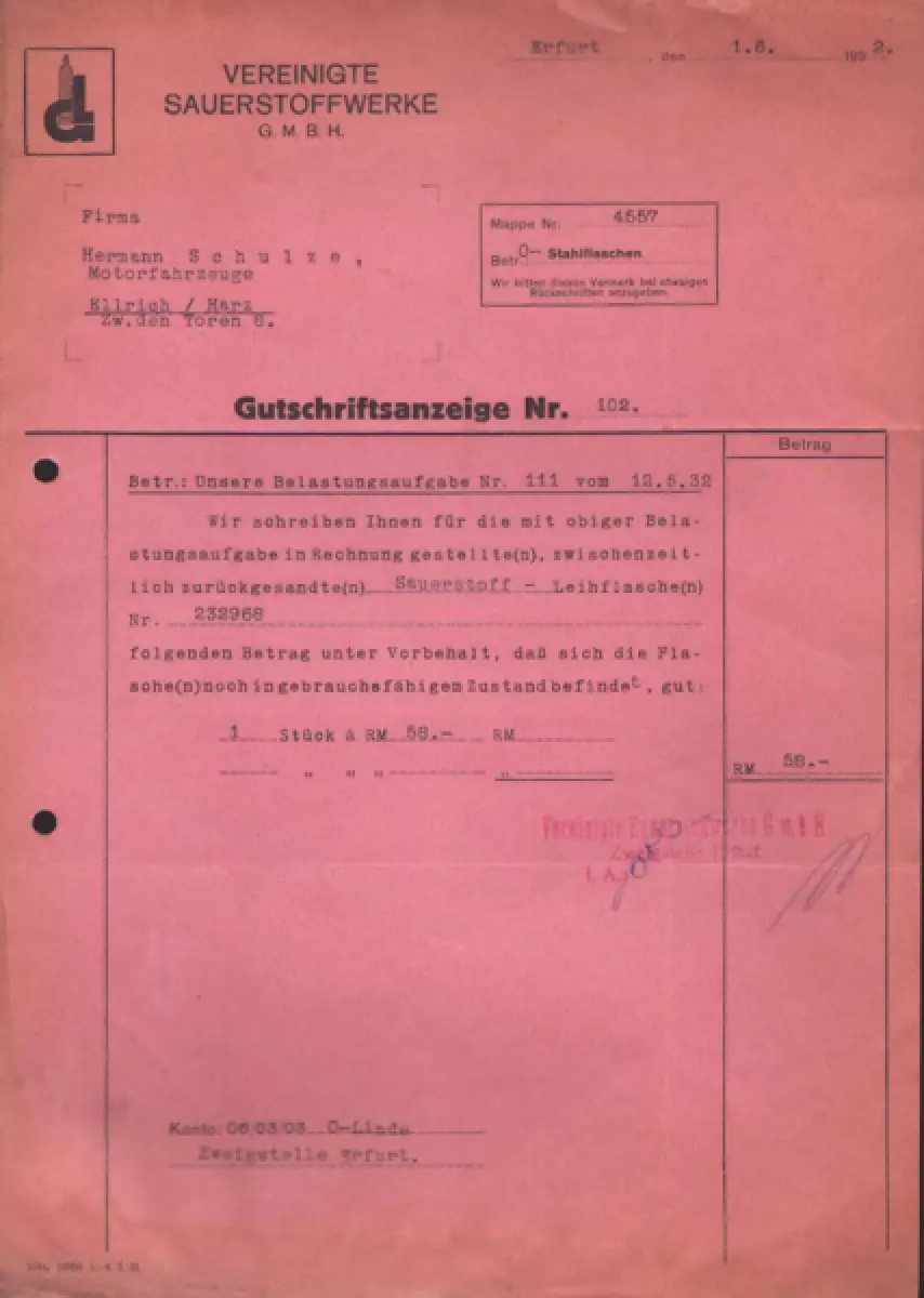 Vereinigte Sauerstoffwerke Berlin / Erfurt Schreiben 1930 / 1932