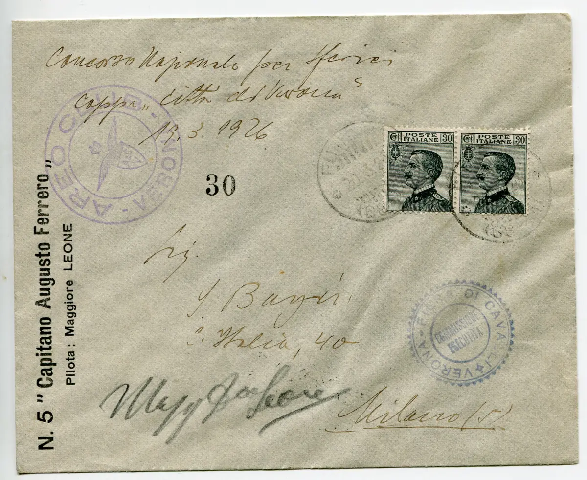 Verona V Gara Aeronautica - Ballone n. 5 Cap. Augusto Ferrero - Verona V Gara Aeronautica - Ballone n. 5 Cap. Augusto Ferrero Aerogramm des Nationalen Sphärenwettbewerbs Verona Cup vom 19.3.26 (Kat. Longhi Nr. 1427, Sächsisches Aerogramm Nr. 54b) - Selten, 30 transportiert - sehr guter Erhaltungszustand Code 160/11