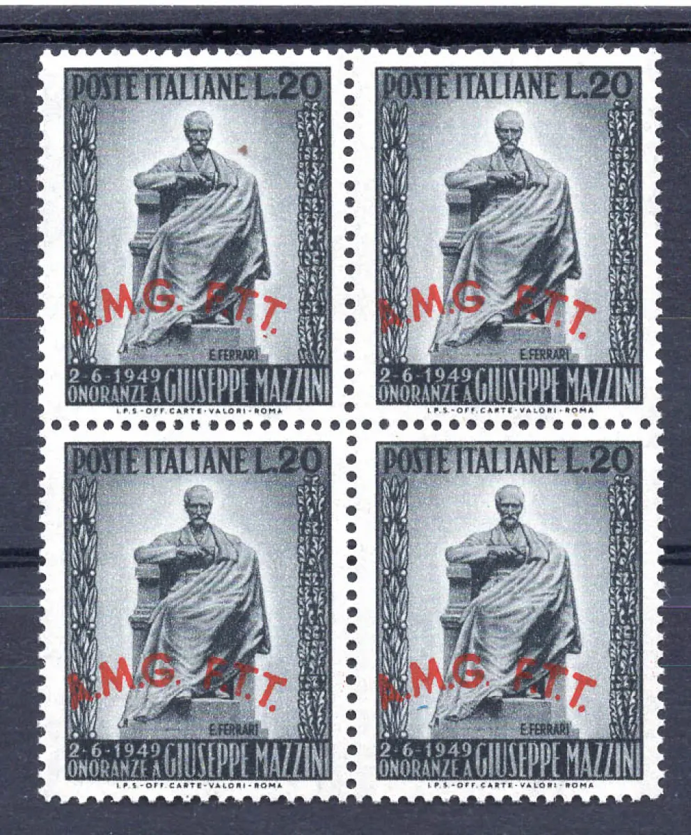 ** MNH - Mazzini Nr. 47a Viertel b. von f. mit links verschobenem Aufdruck, davon ein Exemplar ohne Punkt nach dem letzten T (Posiz. 3) und ein Exemplar ohne Punkt nach dem G (Position. 10) - Ungewöhnlich für Fachmann Nr. 1012/20