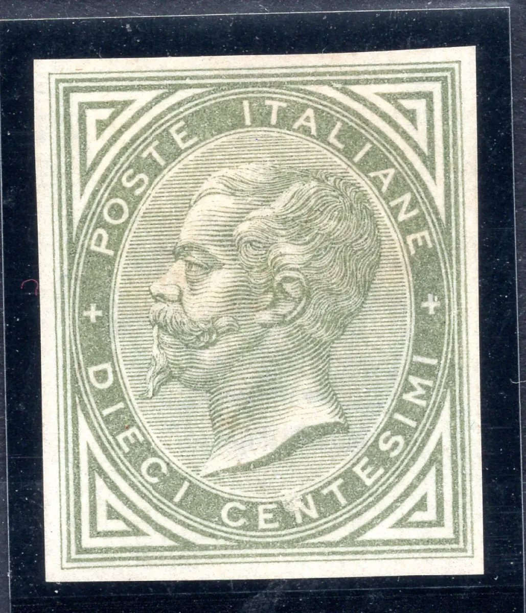 Linguellato MH - Vittorio Emanuele II Cent. 10 Nr. 17 Farbprobe in ungezähntem Olivgrün - Ungewöhnlich Cod. 399/19