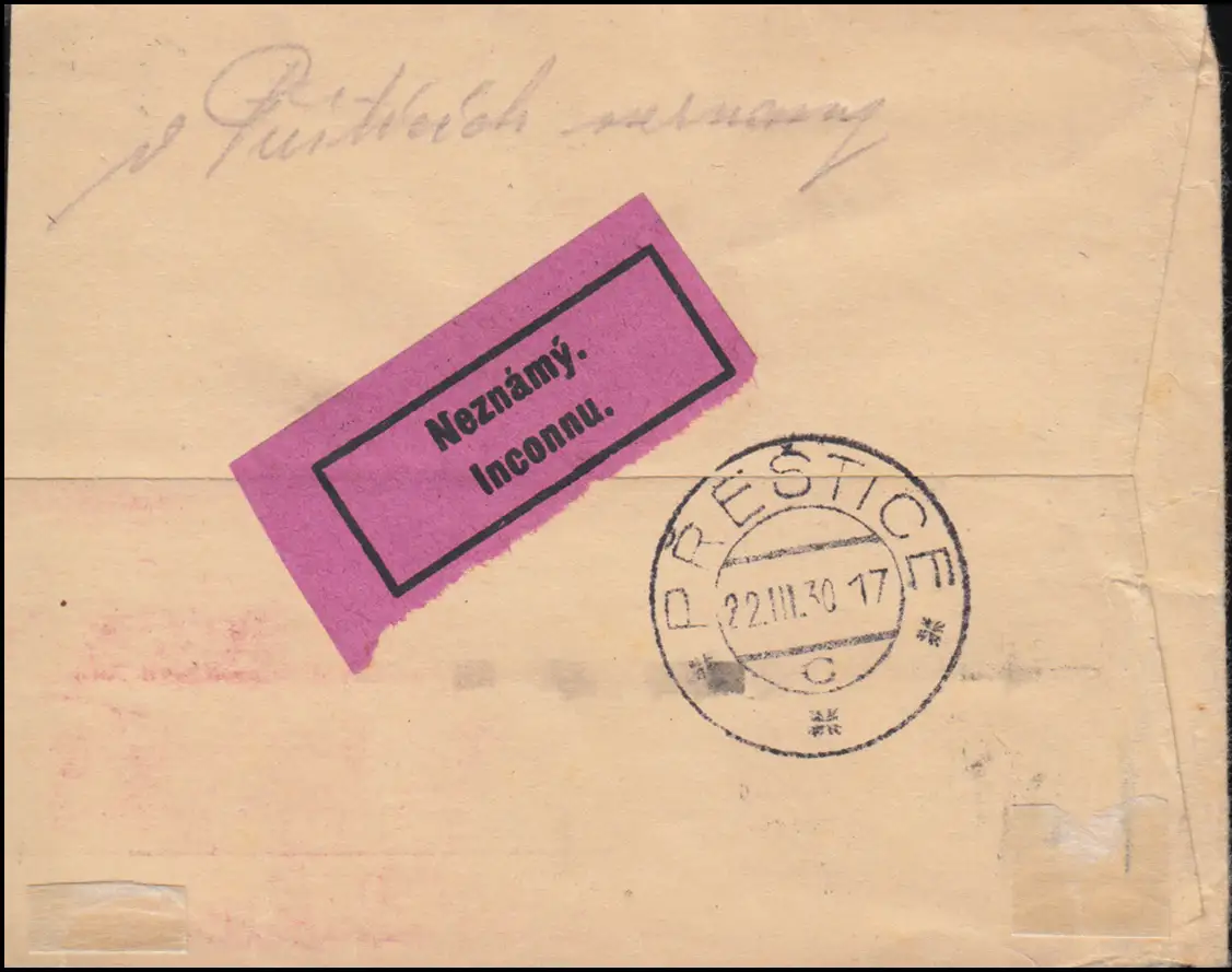 Streifbandausschnitt in die Tschechoslowakei nach Prestice 22.3., roter UNBEKANNT-Aufkleber, zurück in die Schweiz, Werbestempel Genfer Automobilsalon 1930, rückseitig Klebestellen