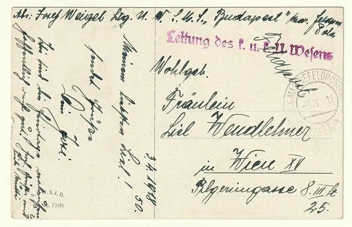 Bemerkungen: Gelaufen mit Stempel.. Einzeiler rot - neben K. u. k. MFPA/3.IV.18. Pola-handschrftl. Absender Josef Weigel. Ltg.U.W.-S.M.S. Budapest.