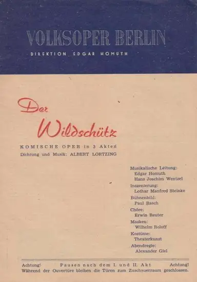 Volksoper Berlin. - Lortzing, Albert: Der Wildschütz. Programmheft der Volksoper Berlin. Direktion Edgar Homuth. Insz.: Lothar Manfred Steinke, musikalische Leitung: Edgar Homuth. Mit u. a.: Mario Taatjani-Hertzel, Hans Belter, Hilde Hoyer, Georg Günther,