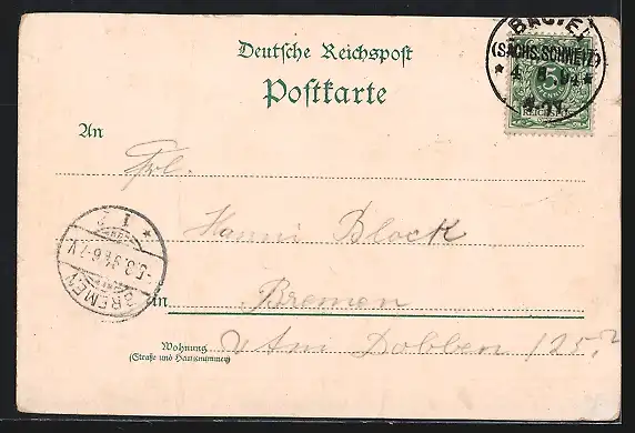 alte Ansichtskarte, gelaufen 1894, Eckknicke li. oben, minimaler Einriss li. oben, guter Zustand
