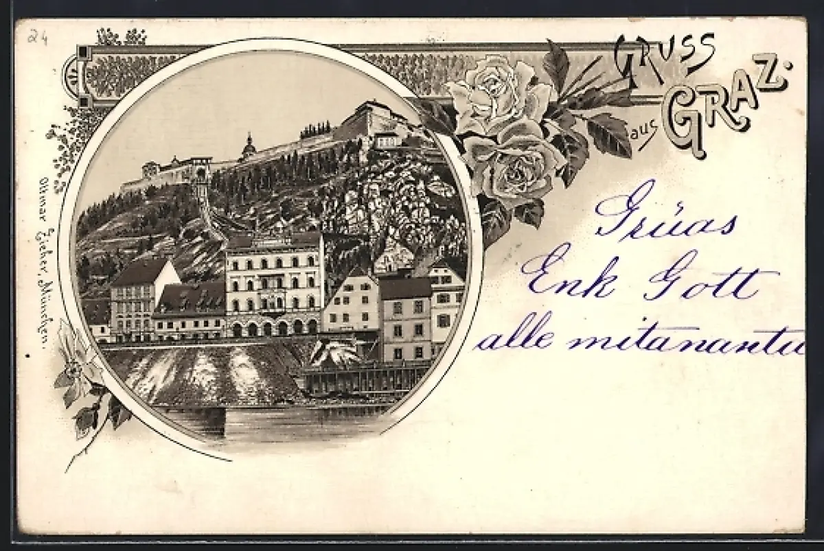 Vorläufer-Lithographie Graz, 1895, Ortsansicht mit Bergbahn