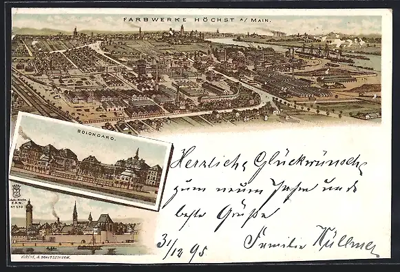Vorläufer-Lithographie Höchst a. Main, 1895, Farbwerke, Bolongaro, Kirche und Schlossturm