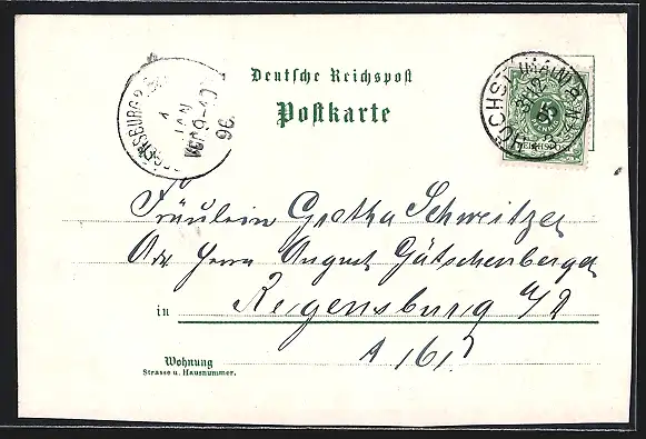Personenbezogene Daten auf der Rückseite der Karte wurden durch blauen Textmarker unkenntlich gemacht. Die blauen Stellen sind auf die Vorderseite durchgeweicht und wirken sich negativ auf das Postkartenfoto aus