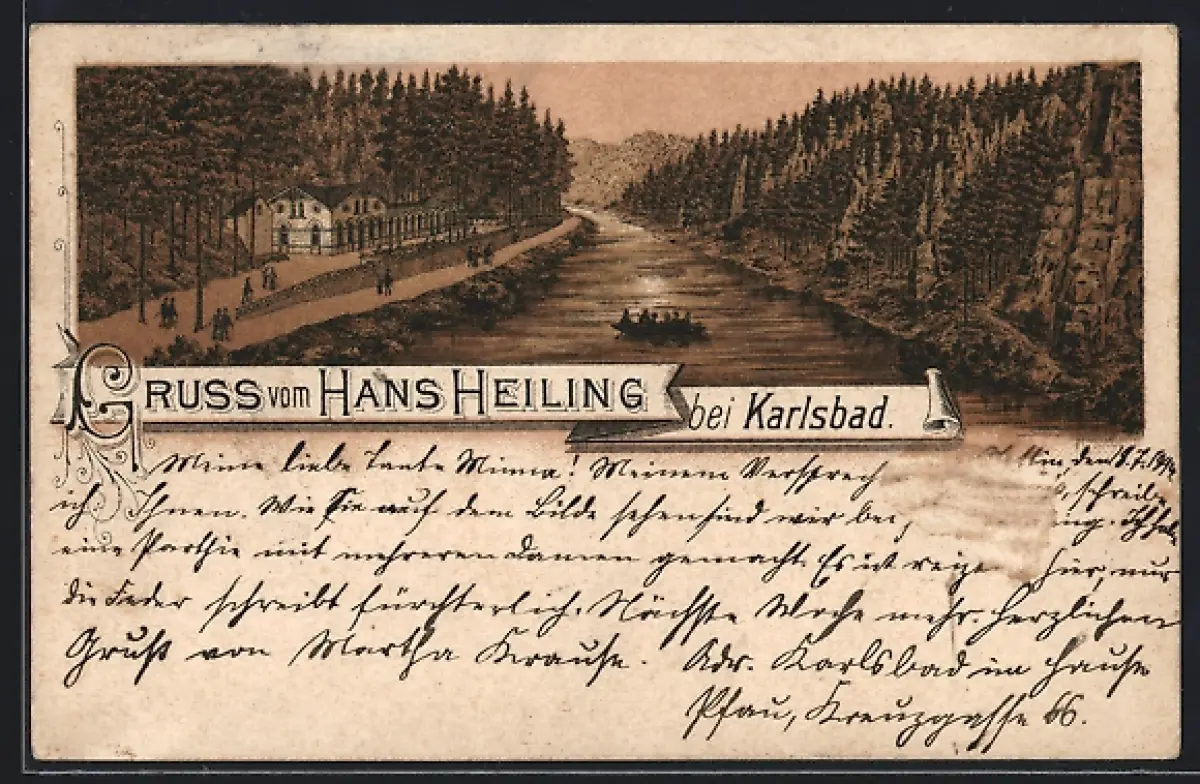 Vorläufer-Lithographie Karlsbad, 1894, Hans Heiling mit Ruderboot