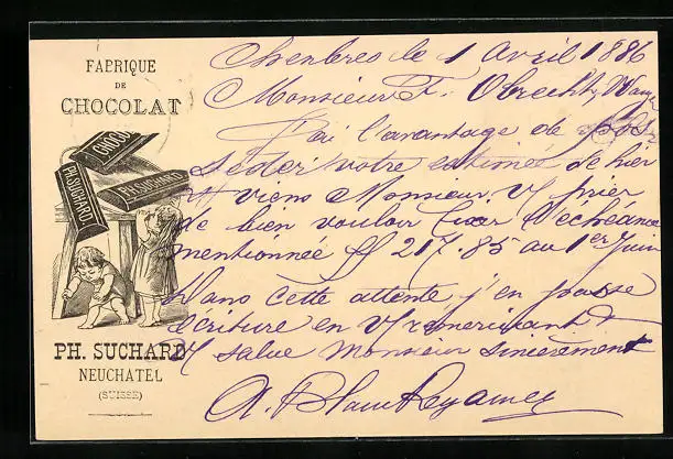 Vorläufer-Lithographie Neuchâtel, 1886, Fabrique de Chocolat, Kinderpaar mit Schokolade, Reklame für Kakao Suchard