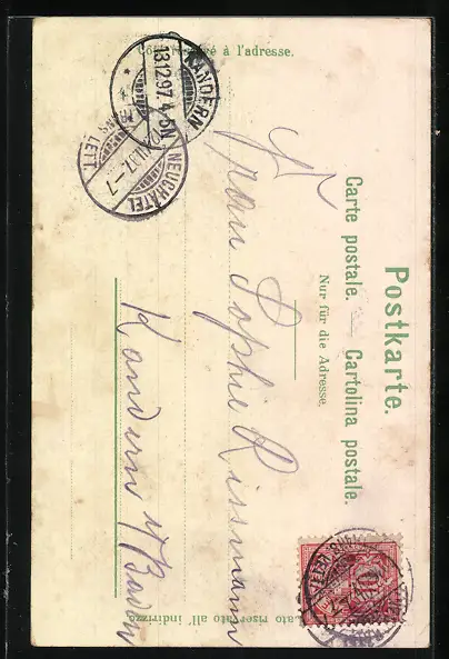 Personenbezogene Daten auf der Rückseite der Karte wurden durch blauen Textmarker unkenntlich gemacht. Die blauen Stellen sind auf die Vorderseite durchgeweicht und wirken sich negativ auf das Postkartenfoto aus