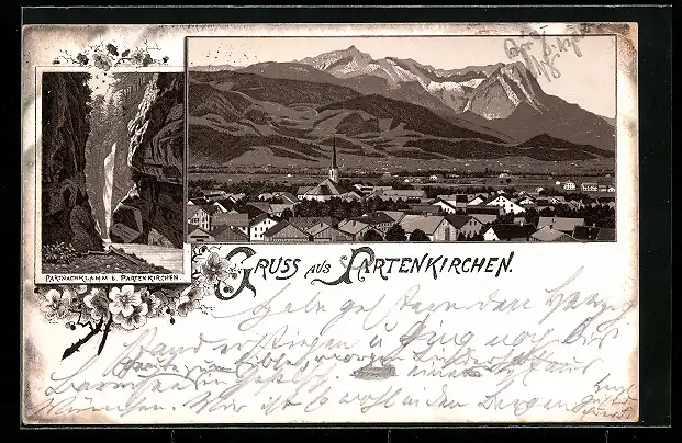Vorläufer-Lithographie Partenkirchen, 1893, Partnachklamm, Ortsansicht aus der Vogelschau