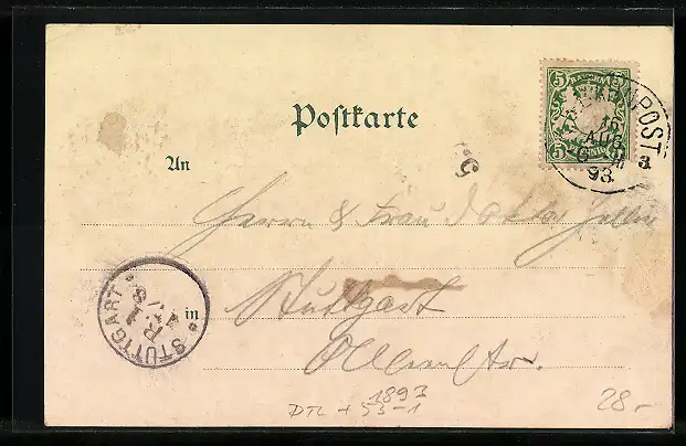 gelaufen 1893, rückseitig Oberflächenschaden, guter Zustand