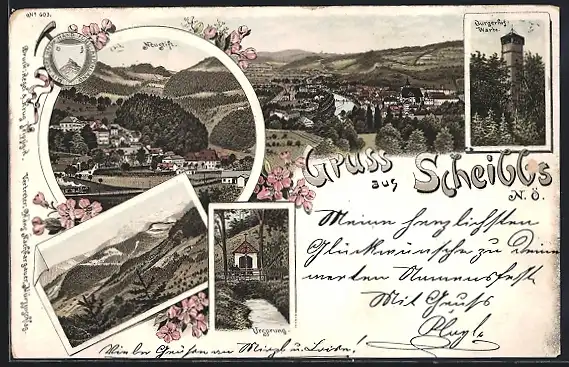 Vorläufer-Lithographie Scheibbs /N. Ö., 1895, Neustift, Burghof-Warte, Ursprung