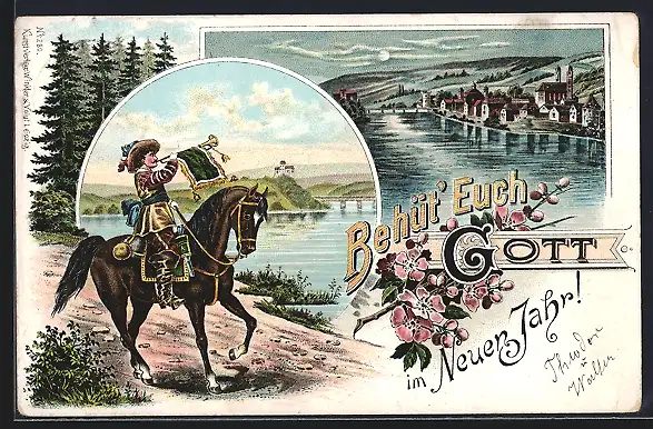 Vorläufer-Lithographie Trompeter von Säckingen zu Pferde, 1894, Uferpartie, Behüt Dich Gott!, Neujahrsgruss
