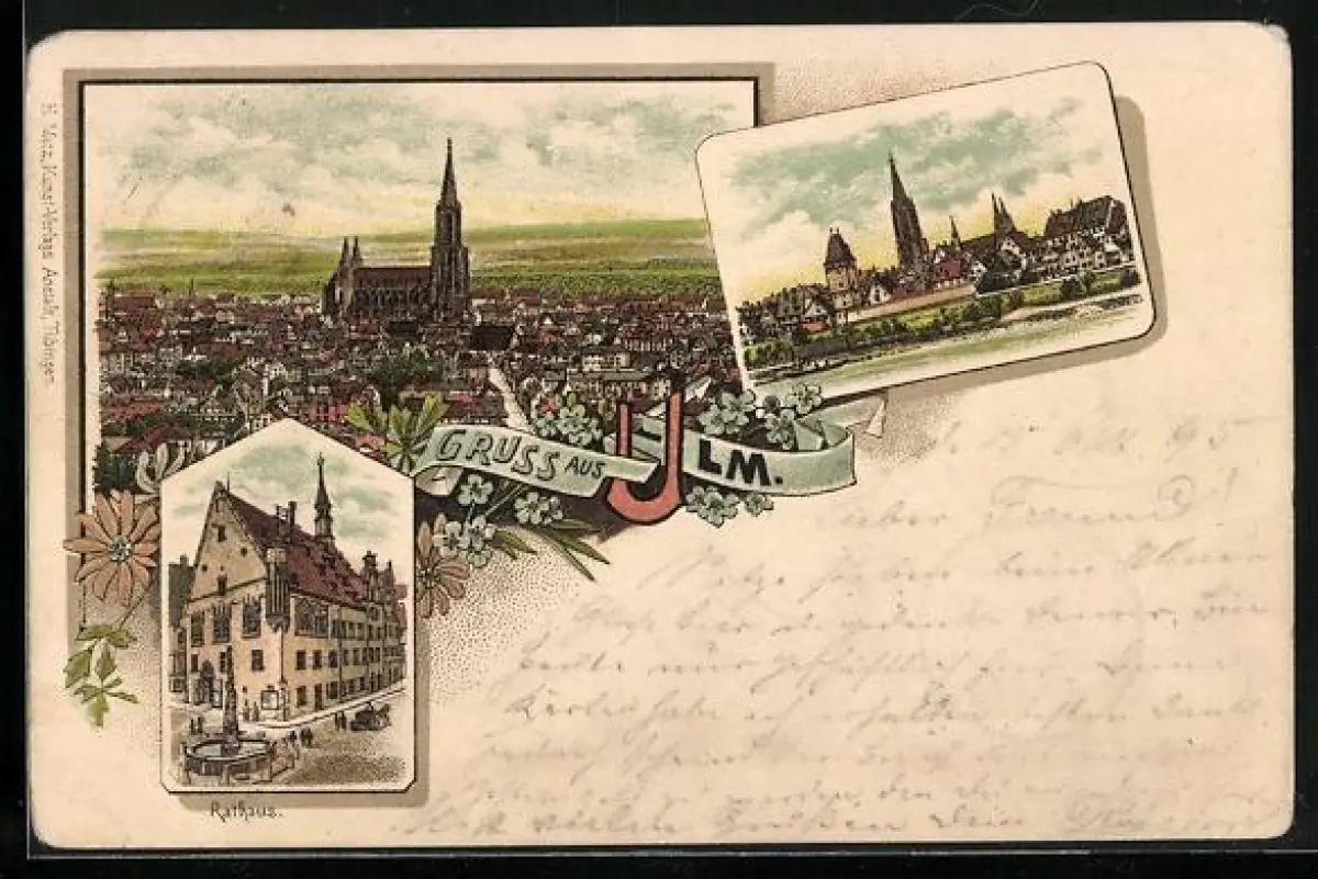 Vorläufer-Lithographie Ulm / Donau, 1895, Münster, Rathaus, Stadtansicht