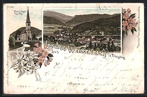 Vorläufer-Lithographie Weissenbach an der Triesting, 1895, Gesamtansicht, Herz-Jesu-Kirche