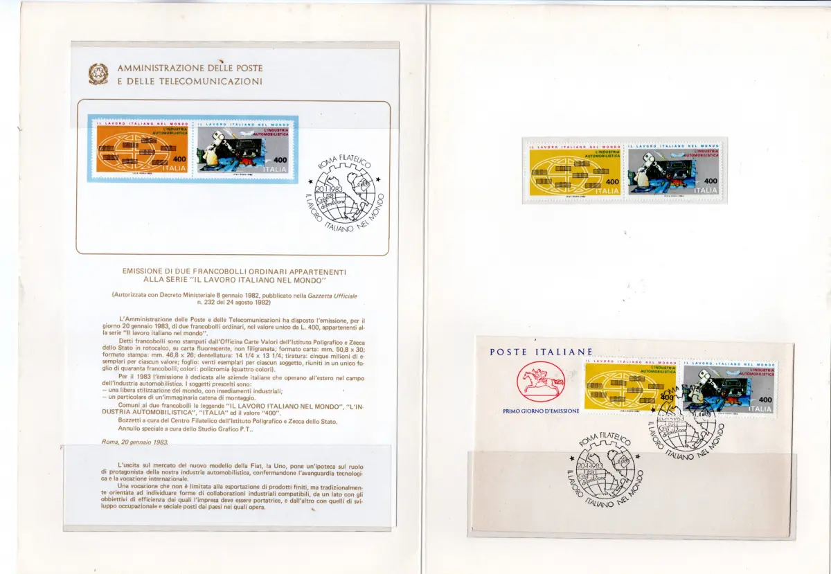 Vorläuferordner - Automobilindustrie 1983, herausgegeben von der italienischen Post anlässlich der Ausgabe Il travail italiano nel mondo vom 20.1.1983 - Enthält die neue Briefmarkenserie, das offizielle Bulletin und die Serie auf Umschlag FDC Cavallino - Selten Cod. 1/WEB