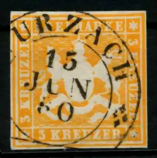 3 Kr Wert aus der Ausgabe Wappen von Württemberg, ohne Seidenfaden, geschnitten, aus der Ausgabe von 1859, allseits unberührt, Steigbügelstempel "WURZACH", ca. 0,5mm hoch signiert, Ecke links unten leicht angestoßen