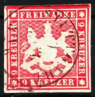 9 Kr Wert aus der Ausgabe Wappen von Württemberg, ohne Seidenfaden, geschnitten, billigste Sorte aus der Ausgabe von 1859, allseits weissrandig, tiefst signiert