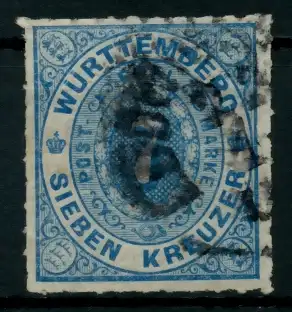 7 Kr Wert aus der Ausgabe Ziffern im Oval von Württemberg, durchstochen, billigste Sorte aus der Ausgabe von 1869