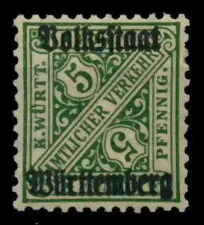 5 Pf Wert aus der Dienstmarkenausgabe von 1919 mit zweizeiligem Aufdruck "Volksstaat Württemberg"