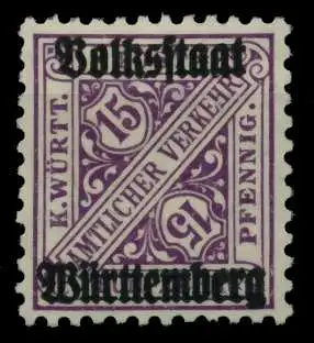 15 Pf Wert aus der Dienstmarkenausgabe von 1919 mit zweizeiligem Aufdruck "Volksstaat Württemberg"