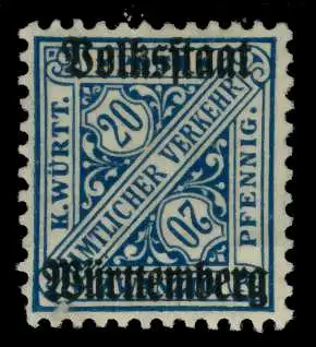 20 Pf Wert aus der Dienstmarkenausgabe von 1919 mit zweizeiligem Aufdruck "Volksstaat Württemberg"