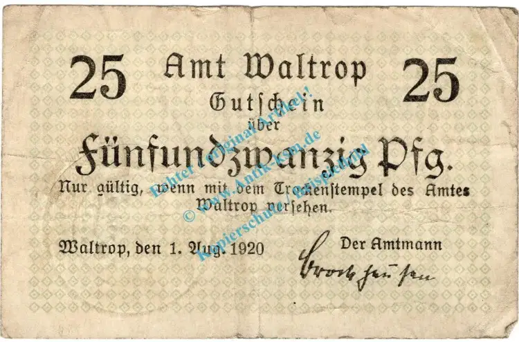 Waltrop , Notgeld 25 Pfennig Schein in gbr. Tieste 7690.05.01 , Westfalen 1920 Verkehrsausgabe
